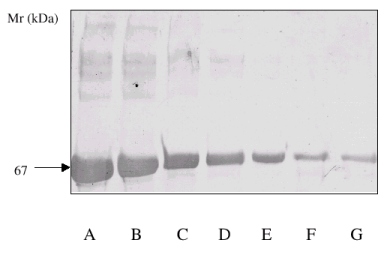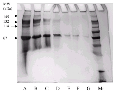 | Figure 1: SDS-PAGE of protein extracts from samples of sunflower oil taken at different steps during refining (from Zitouni et al. 2000) A: Crude oil , B: Acidification and neutralisation, C: Pregumming, D: Washing, E: Bleaching, F: Gumming, G: Deodorizing |